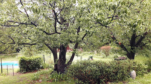 Por la lluvia me senté en el centro de la galería en vez de en la esquina donde me siento habitualmente. Justo enfrente hay un bello y frondoso alcanfor. A la derecha, un nogal y a la izquierda, un algarrobo con el tronco verde por el musgo, pero recién hoy vi el musgo, ¿ya estaba y yo no lo vi, o apareció con la lluvia de ayer y hoy? Silencio de lluvia.